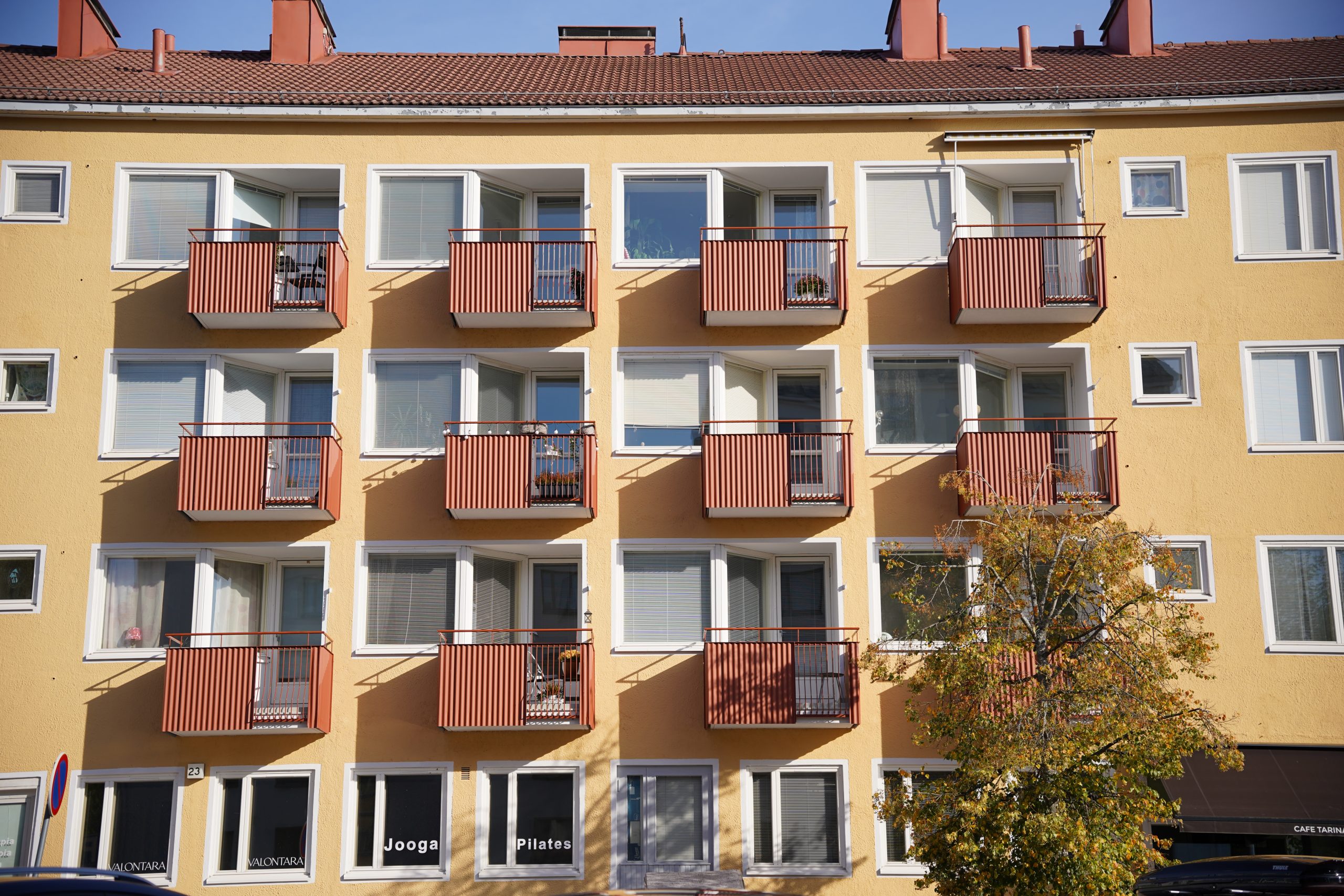 CAFEの建物の側面。配色もかわいらしく、バルコニーの形も日本で見るものと少し違う…