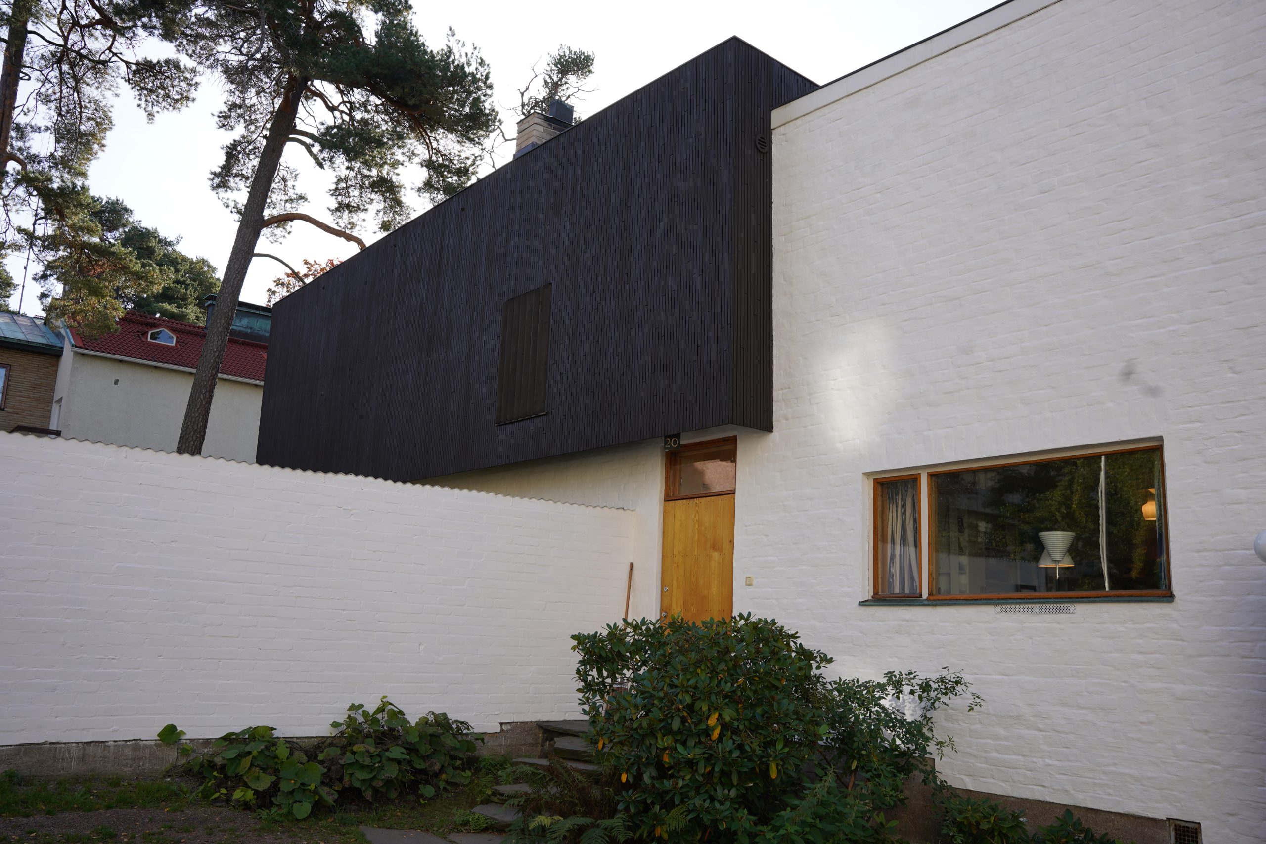 中庭から見たアアルト自邸!白い建物に、茶色のスクエアがはまっているような見た目。絶妙なバランス!